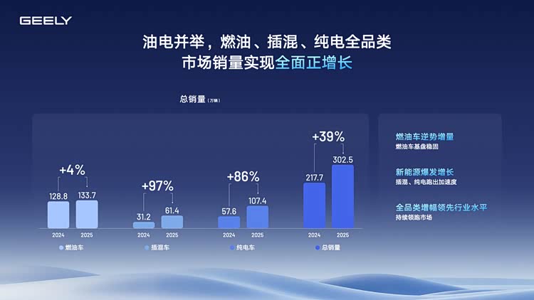 2025年,吉利全年销量突破302万辆,同比增长39%,超额完成上调后的目标。但比总量更值得关注的是结构的变化。新能源成了真正的增长主引擎。全年新能源销量168.8万辆,同比暴增90%,渗透率首次超过55%。这意味着,每卖出两辆吉利,就有一辆是新能源。