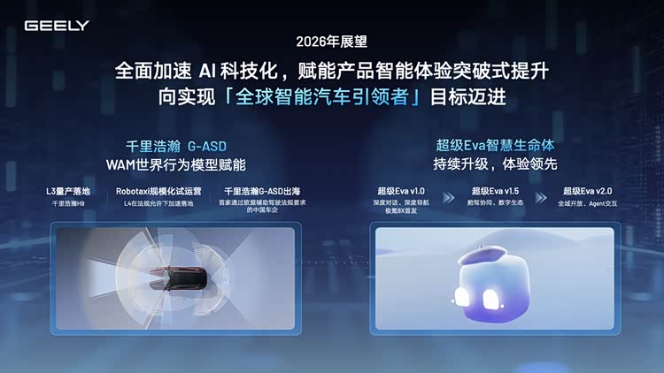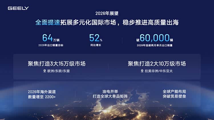 2026年,吉利将迎来又一个产品大年,多款新品覆盖从主流到豪华、从燃油到新能源的各个细分市场,全年销量目标锁定345万辆。在智能化、高端化、全球化的多重驱动下,吉利正朝着“全球智能汽车引领者”的目标稳步迈进。