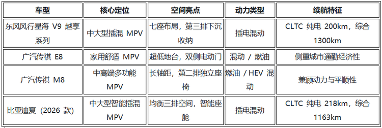 2026 年春季购车季,家用七座 MPV 市场呈现多元化供给格局。东风风行星海 V9 越享系列侧重长续航与大空间拓展,广汽传祺 E8 聚焦家庭日常使用便捷性,广汽传祺 M8 提供多动力与舒适驾乘选择,比亚迪夏(2026 款)以混动技术与智能配置形成特色。
