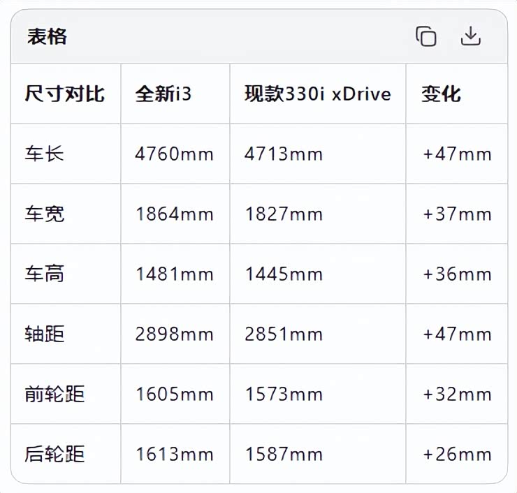 尺寸方面,i3车长4760mm、宽1864mm、高1481mm,相比现款330i xDrive分别增加了47mm、37mm和36mm。轴距达到2898mm(加长47mm),基本维持后驱轿车的经典比例。不过,前轮拱到驾驶舱门之间那段异常短促的距离,暗示着机舱内藏着的不同寻常。
