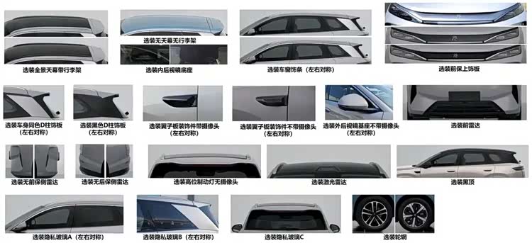 内饰方面,此次并未曝光,参考比亚迪最新的车型,更强调精致感,配置方面,提供车顶行李架、全景天窗、D柱饰板、前翼子板摄像头、车头雷达 、可选车顶激光雷达、双色车身、隐私玻璃等。