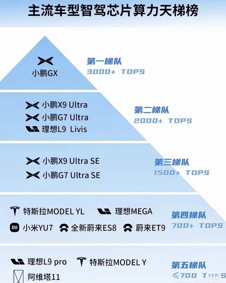 旗舰车型小鹏X9 Ultra和小鹏G7 Ultra,算力也高达2000 TOPS,中端产品的智驾芯片算力达到1500 TOPS,市场上绝大部分20万到35万之间的车型,智驾芯片算力基本是700 TOPS,当然这个算力也属于高性能,15万以内的车型,芯片性能就很一般了,毕竟连车企自己都不想宣传。