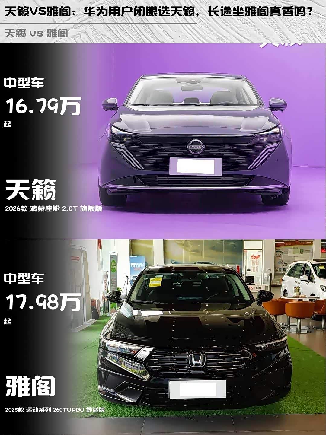 最近在纠结天籁2026款鸿蒙座舱2.0T旗舰版和 雅阁(参数|询价)2025款运动系列260TURBO舒适版的朋友看过来!作为深度体验过两台车的车主,掏心窝子分享真实对比感受👇
