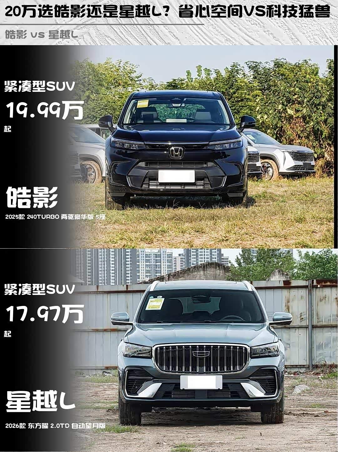 最近在选20万级SUV的朋友看过来!今天深度对比两款热门车型——本田 皓影(参数|询价)2025款 240TURBO两驱豪华版和吉利星越L 2026款东方曜2.0TD自动望月版,看完这篇你就知道哪款更适合你!🔥