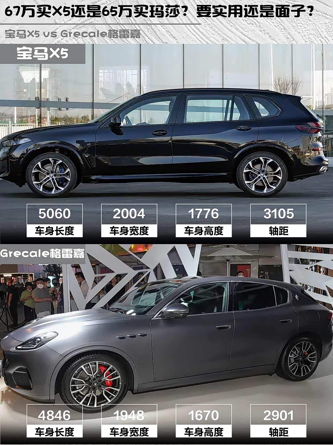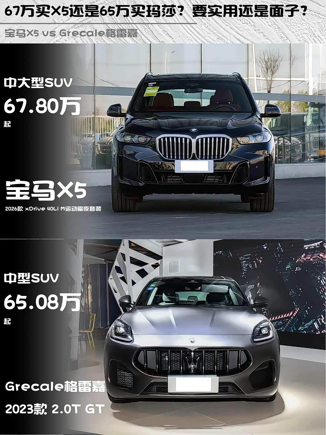 最近身边好几个朋友都在纠结宝马X5 2026款 xDrive 40Li M运动曜夜套装和玛莎拉蒂 Grecale格雷嘉(参数|询价) 2023款 2.0T GT怎么选,作为深度体验过两台车的"老司机",必须来唠唠这两台豪华SUV的差异点!🔥