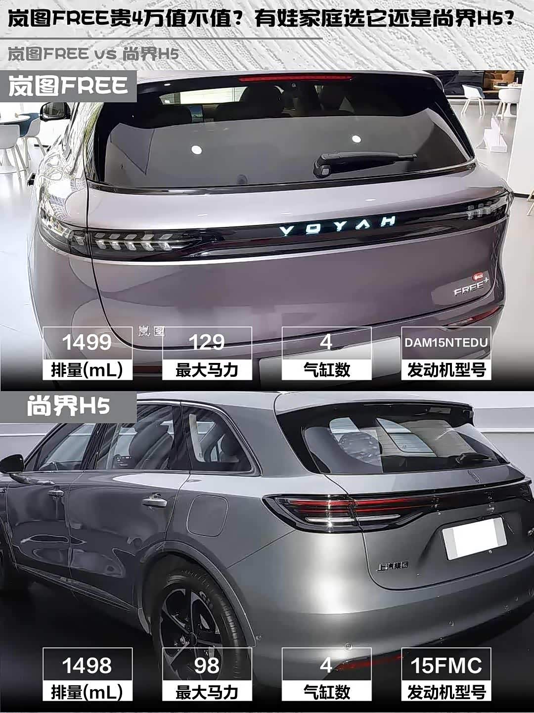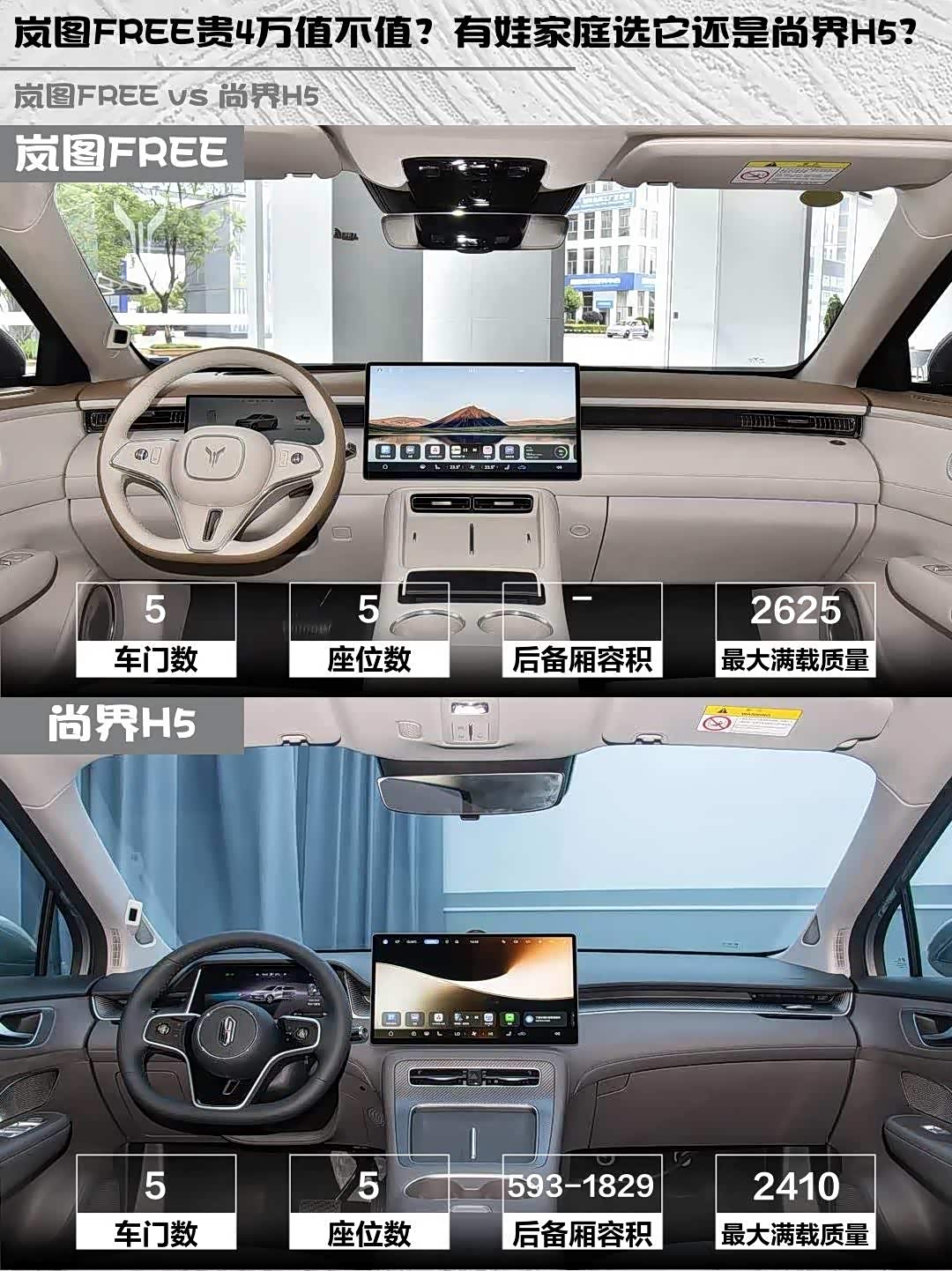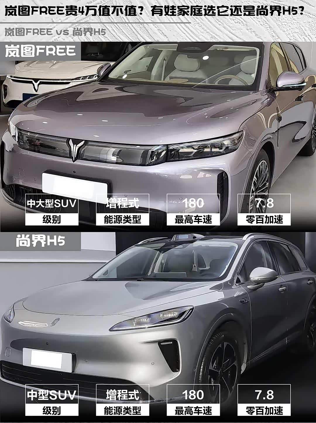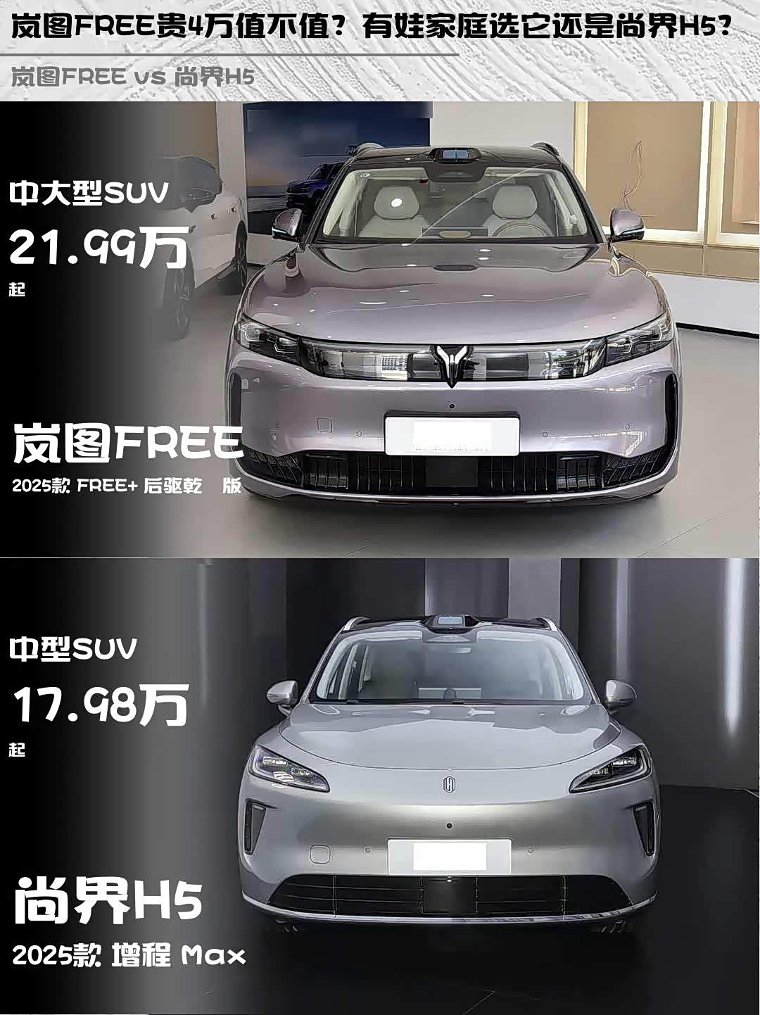 岚图FREE 21.99万比尚界H5贵4万,但多了终身三电质保、电吸门、车载冷暖箱。尚界H5 17.98万入门即高配,还有0首付金融政策,预算紧张的话性价比很顶。💰