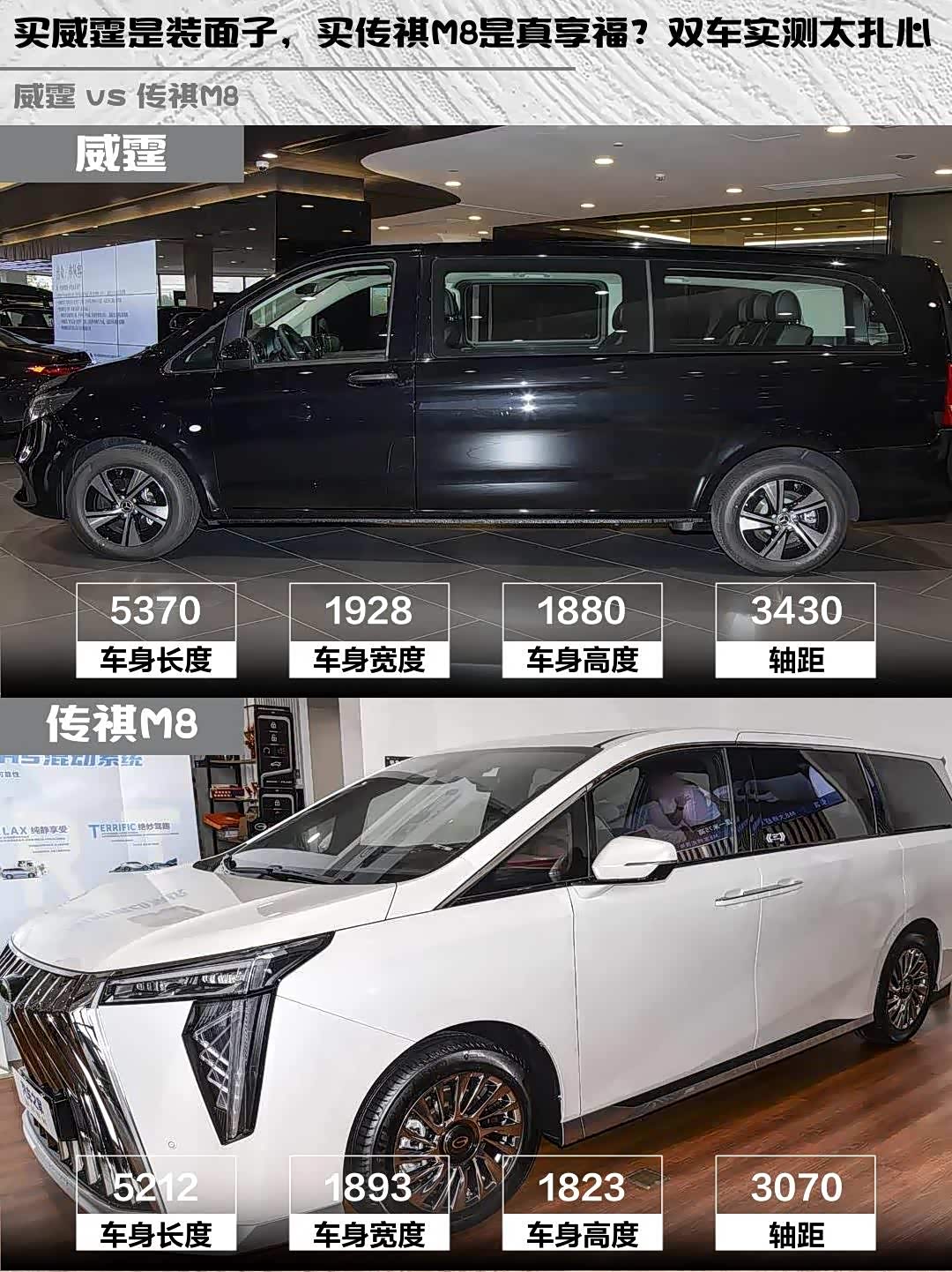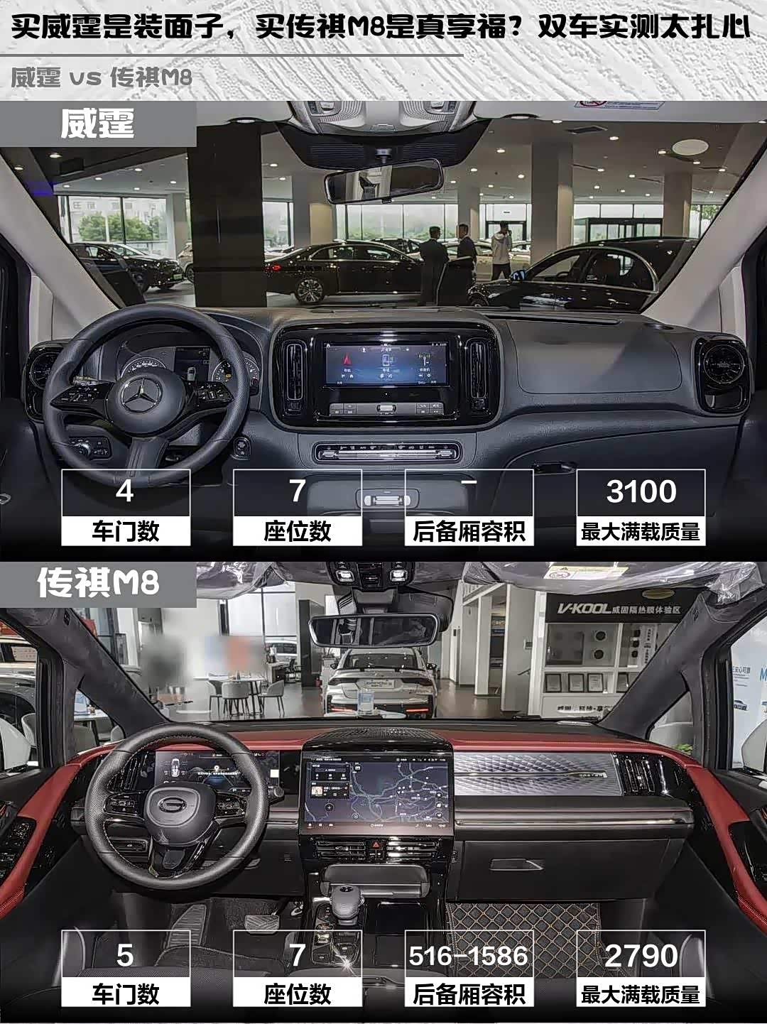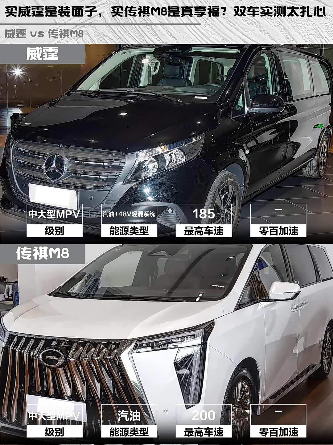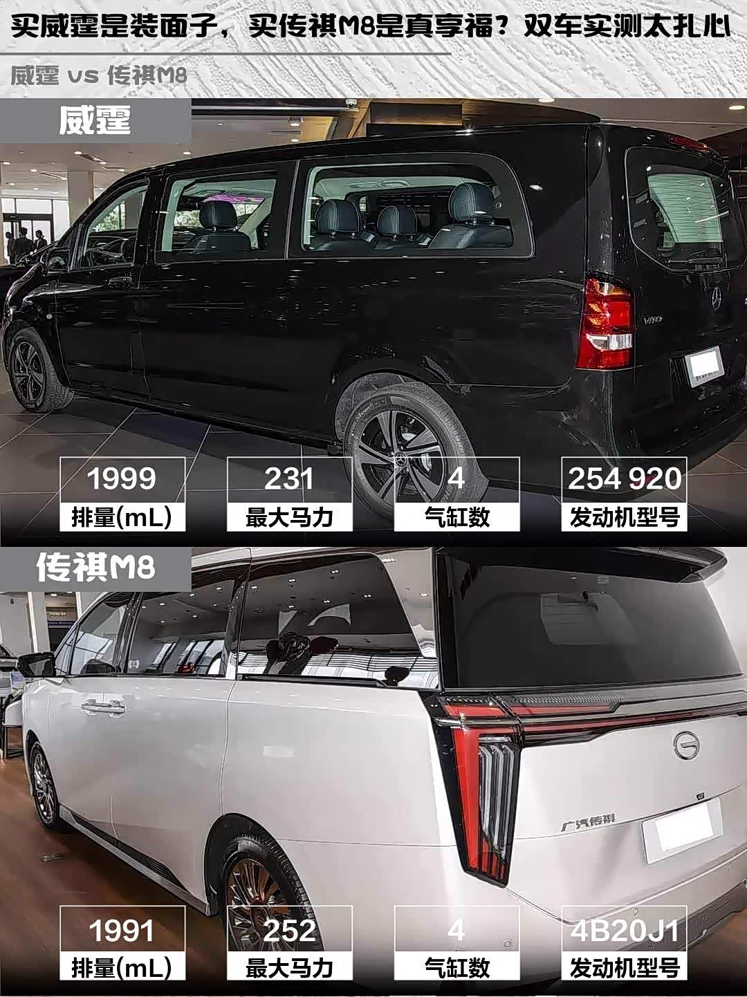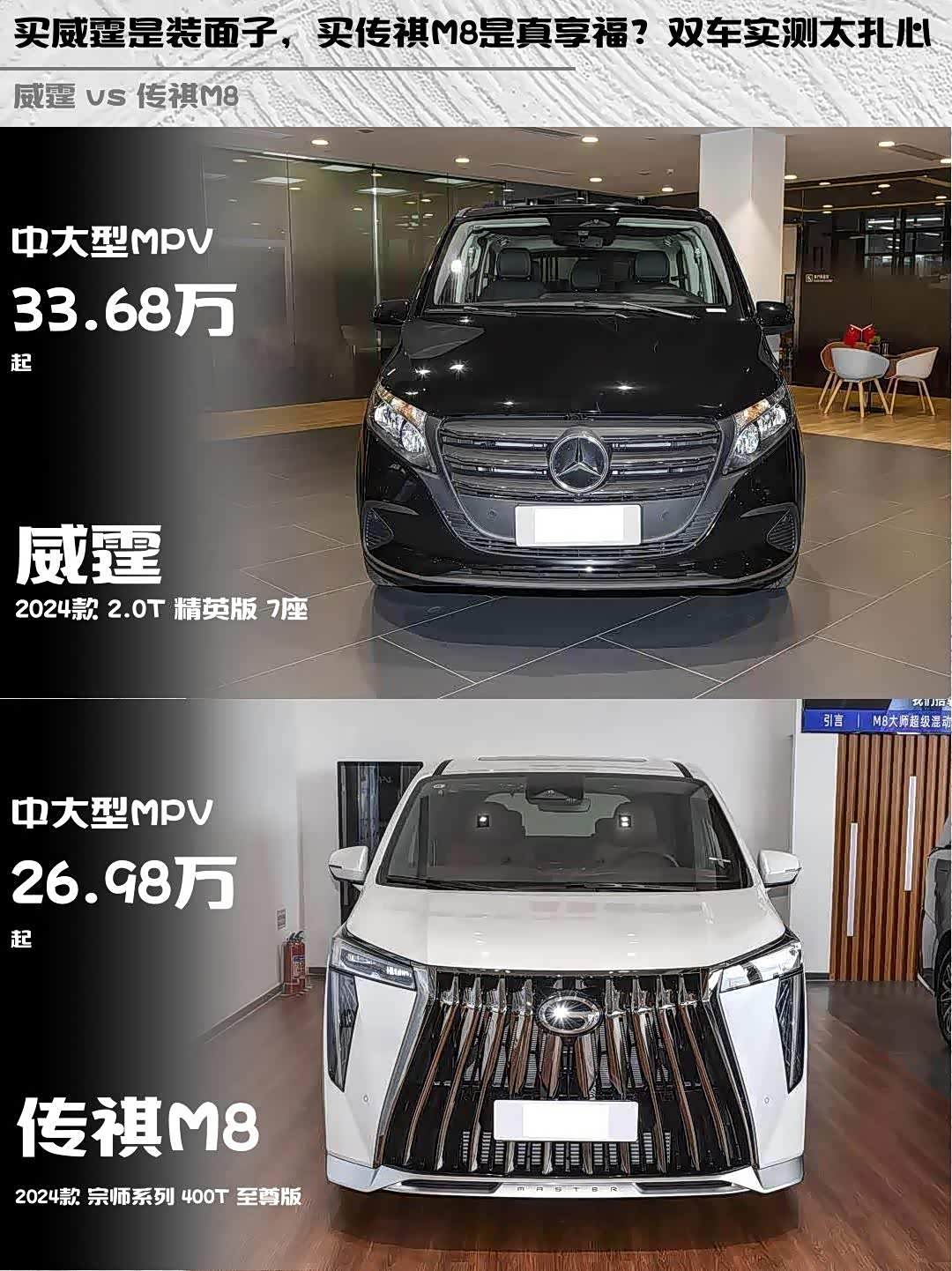 最近在选MPV的朋友看过来!今天深度对比两款热门中大型MPV—— 奔驰威霆(参数|询价) 2024款 2.0T 精英版 7座和传祺M8 2024款 宗师系列 400T 至尊版,实测干货分享给你们~ 🚗💨