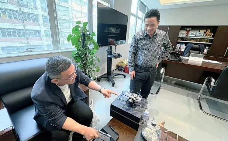 《汽车商业评论》在王华文的办公室进行采访时,他的同事拿着一架亿航(EHang)eVTOL的模型准备向他汇报工作。