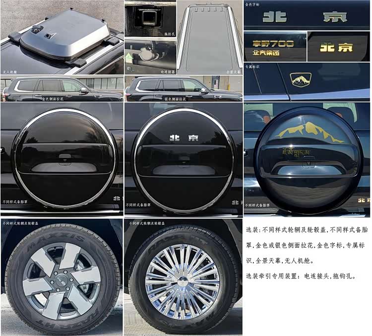 选装部分,享野700车顶的激光雷达格外醒目,说明北汽会提供给新车更好的智能辅助驾驶能力。此外,除了金色车标和雪山标识的特别版本,全景天幕和2.5吨拖挂能力也会配备在享野700身上。而新车最大的亮点在于提供了顶部的无人机舱位,算是为特定人群创造出了特殊的需求,但选配后的车身高度会提高到2164mm,进出一些地库时会被限制。