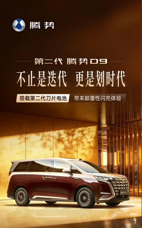 日前,腾势汽车发布了新款 腾势D9(参数|询价)官图,新款车型将搭载第二代刀片电池及闪充技术,依旧提供插混和纯电车型。