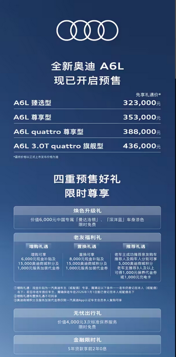 从整体来看,全新奥迪A6L在外观造型、座舱智能化、动力匹配及底盘调校上均进行了系统升级。车身尺寸保持同级优势,内部空间利用率高,三屏布局提供沉浸式操作体验。动力方面,2.0T与3.0T V6动力覆盖常用工况,同时搭载48V轻混及双电机混合系统,兼顾动力响应与燃油效率。底盘及四驱系统保证了多路况的行驶稳定性。整体来看,新车在豪华中型轿车市场提供了清晰的选择逻辑,可满足不同用车需求和预算层次的消费者。