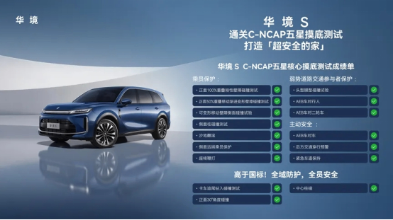 华境S有着超C-NCAP 2024五星标准,主动+被动双拉满,全维防碰撞系统CAS4.0守护用户安全,覆盖前向、侧向、后向多维防护,车身采用1500MPa一体化热成型前地板骨架,1500MPa一体式热成型门环,配备2000MPa超高强钢侧门防撞梁, 还有9气囊14腔体矩阵,配套宝钢高强钢、延锋安全系统、奥托立夫气囊、福耀玻璃等顶级被动安全硬件。