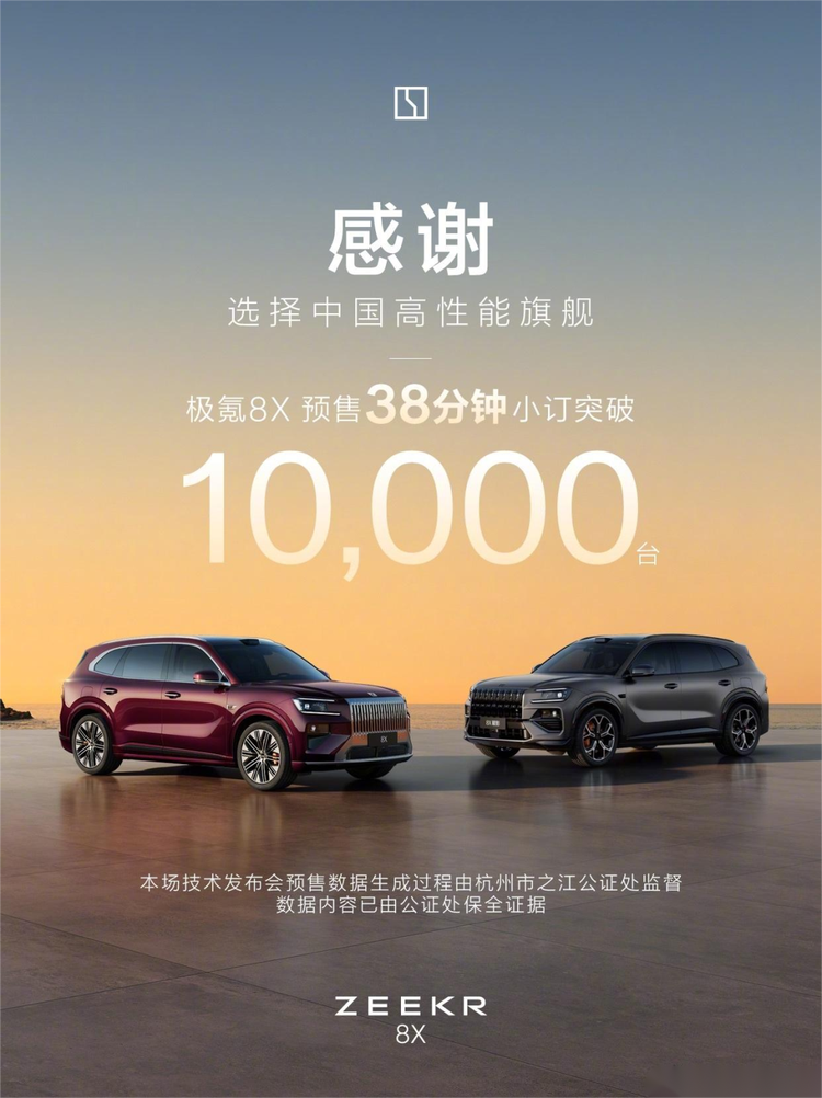 最具说服力的就是真金白银的支持,预售开启38分钟,极氪8X订单量即突破1万台。需要强调的是,该预售数据生成过程,由权威公证机构全程监督,含金量可见一斑。