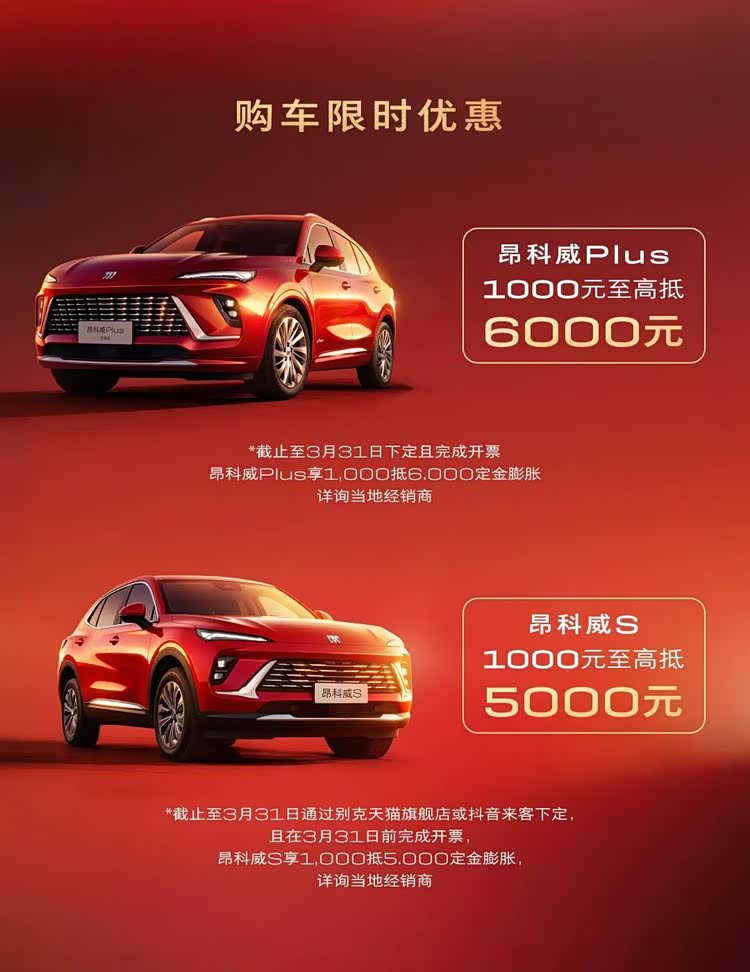 另外,在售别克昂科威S提供2款车型配置,一口价13.99万-14.99万元。而据官方信息显示,用户在3月31日前下定别克昂科威S并完成开票,可享1000元抵5000元的定金膨胀,即终端限时优惠价为13.59万元起。