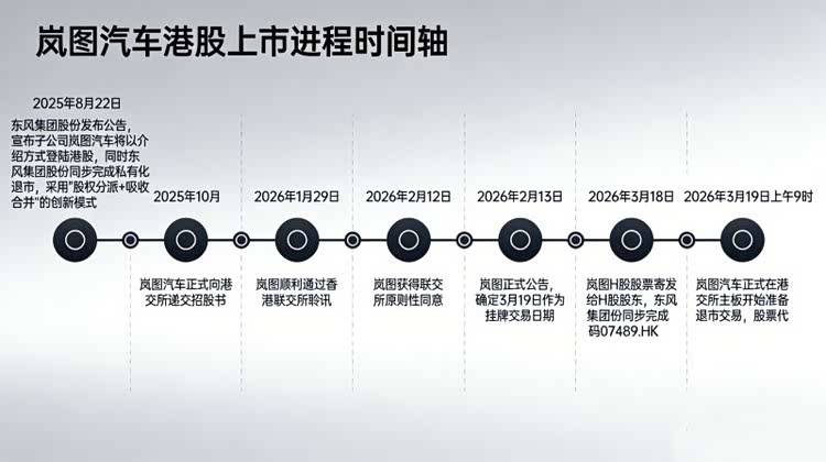 同年10月,岚图递交招股书,披露经营数据与发展规划;2026年1月29日通过港交所聆讯,2月12日获原则性同意,完成全部前置审批,2月13日官宣3月19日挂牌。