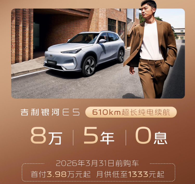 从冬日通勤的续航保障,到户外露营的场景适配,再到全家出行的舒享体验,26款银河E5用全场景的产品实力,打破了纯电出行的所有局限。再加上8万5年0息的金融方案、三电终身质保、免费充电桩安装等多重购车福利,让每一位消费者都能以亲民价格,享受无拘无束的纯电出行生活。26款银河E5,以全能之姿,陪你解锁生活的每一种美好可能。
