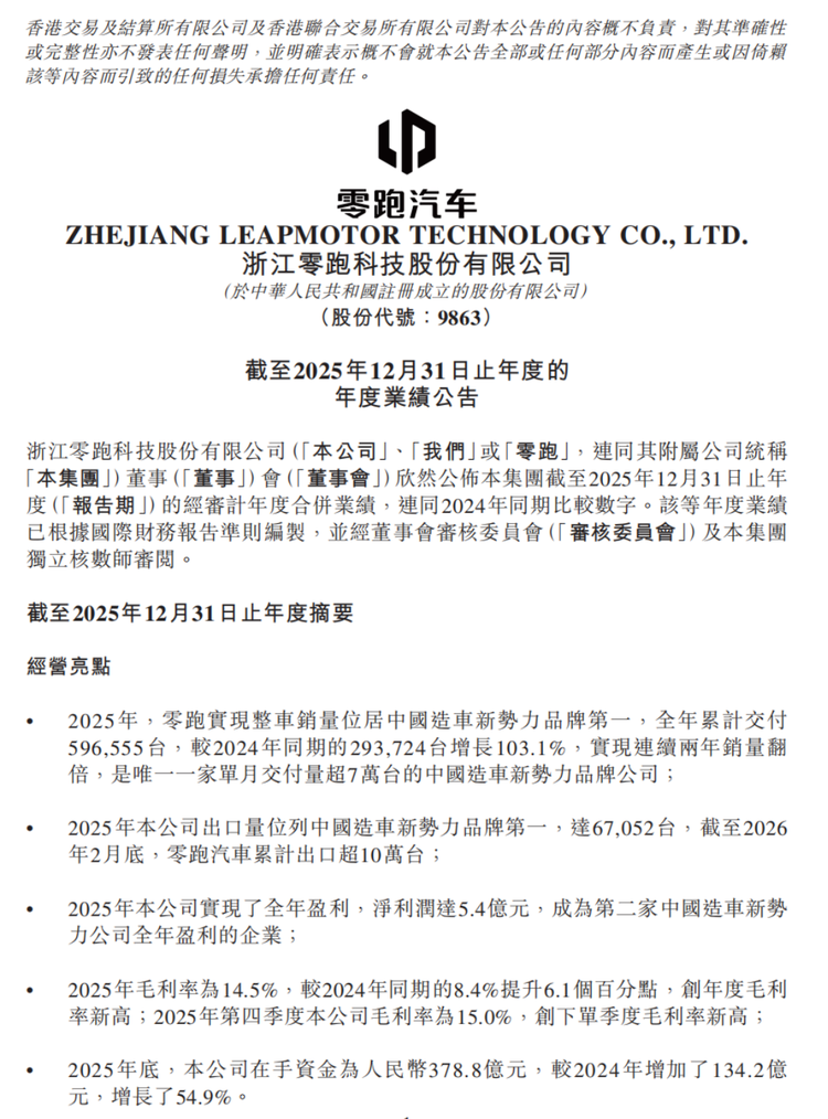财报显示,零跑汽车全年实现净利润5.4亿元,首次实现全年度盈利,成为继理想之后第二家达成这一里程碑的新势力车企。“销量规模的快速增长是能够实现全年盈利的最核心原因。”在随后业绩电话会上,零跑汽车副总裁、CFO(首席财务官)李腾飞表示。2025年,零跑交付新车59.66万台,连续两年销量翻倍,位居中国新势力品牌销量榜首;全年营收647.3亿元,同比增长101.3%;毛利率为14.5%,创年度新高;在手资金378.8亿元,保持正向经营现金流与自由现金流。