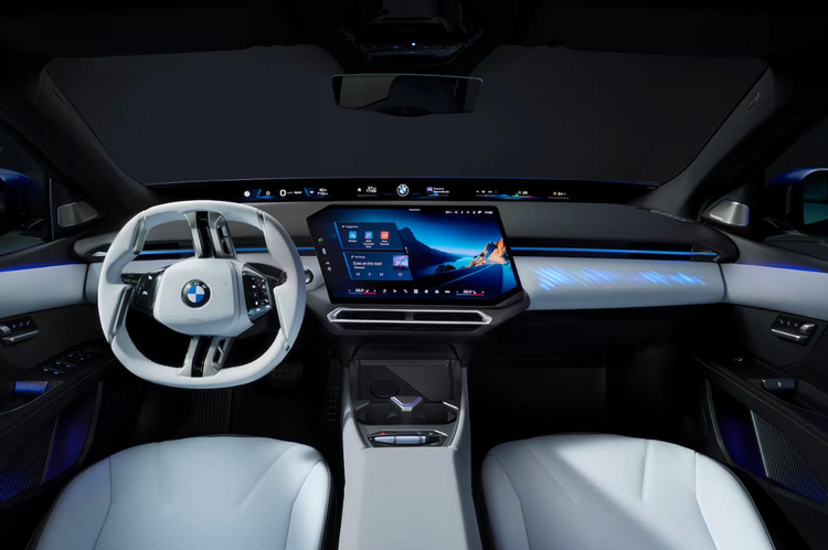内饰就更有意思了。iX3上备受争议的四幅方向盘得以保留,17.9英寸平行四边形中控屏向驾驶员一侧倾斜,在前挡风玻璃下还有一块远端屏,不由得让人联想到小米YU7的设计,果然好的设计总是心有灵犀。