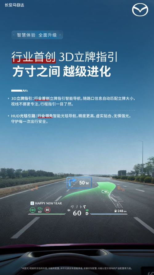 开车出行,导航看不清、走弯路是车主的普遍烦恼,尤其是复杂路口、夜间行车、隧道通行时,传统导航的平面信息总让人分心。EZ-60此次升级的全球首发裸眼3D-HUD双创新,正是为破解这一痛点而来,让导航从“信息传递”升级为“沉浸式守护”。同级唯一的100英寸裸眼3D-HUD,搭载行业首创的“3D立牌指引智能导航”,将平面导航箭头转化为立体立牌,路口转向、高速匝道切换一目了然,新手司机也能精准判断路线,无需低头看屏分心。