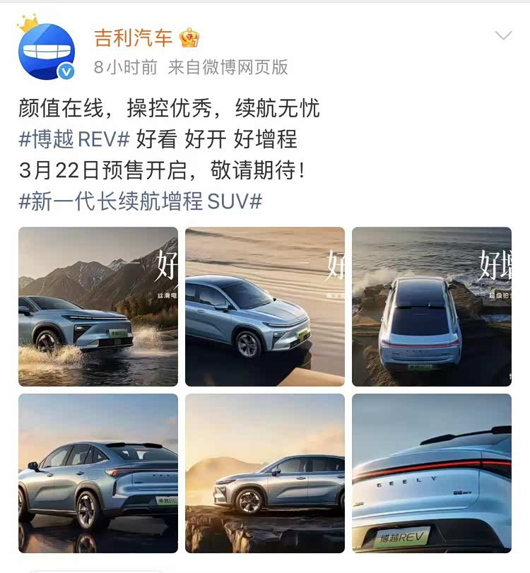 车家号·0浏览·2026-03-19 19:08 · 广东日前,吉利汽车官方宣布,吉利 博越REV(参数|询价)将于3月22日开启预售。作为轿跑风格SUV,吉利博越REV将搭载增程动力系统,官方宣称车辆具备375公里的纯电续航与1525公里的综合续航里程。