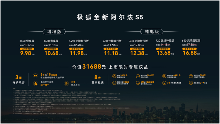 3月18日,极狐汽车举办首个全场景AI发布会,正式推出全新阿尔法S5。这场发布会不仅抢先占据了“AI上车”的话题C位,也让“AI高性能宽体轿跑”这一全新品类进入大众视野。新车共推出7款配置,涵盖纯电与增程两种动力形式,补贴后售价9.98万元起,最高不超过16.88万元。