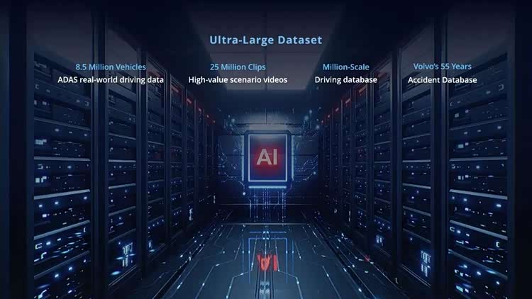 其次是“超大数据集”,千里浩瀚G-ASD不仅拥有吉利旗下累计850万辆车的辅助驾驶和累计百亿智驾里程,还拥有行业领先的2500万clips模型数据片段与沃尔沃55年事故数据库。