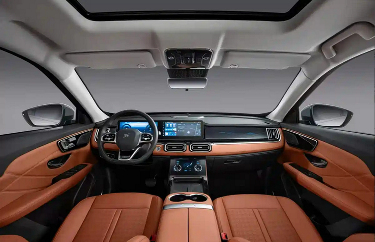 进入车内,山海L7超越版采用黑橙配色,座舱氛围与燃油版形成区分。中控布局升级为12.3英寸液晶仪表与12.3英寸中控屏组合,在显示面积与信息集成度上有所提升。功能层面支持360°全景影像与180°透明底盘功能,这类配置在低速行驶、窄路会车以及泊车过程中具备实际辅助价值,尤其在复杂路面环境下可以降低盲区影响。