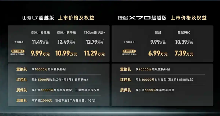 3月19日,2026款捷途X70超越版与山海L7超越版同步上市,两条产品线分别对应燃油与插混市场。从价格结构来看,捷途X70超越版提供两款配置,指导价覆盖9.99-10.39万元区间,限时购车价格下探至6.99-7.39万元;山海L7超越版则推出三款配置版本,指导价区间为11.49-12.79万元,限时价格为9.99-11.29万元。两款车型在尺寸平台保持一致,但在动力形式与使用场景上形成区隔,适合不同用车需求的用户选择。