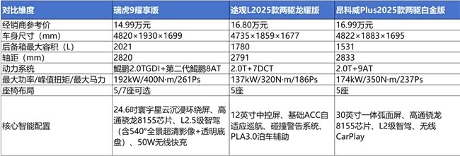 在电动车大行其道的今天,燃油车凭借其成熟可靠的技术底蕴和便捷的补能体验,依然是众多消费者的首选。其中,15万以内的燃油SUV市场仍充满活力,油车推荐15万左右的预算区间,仍是许多消费者的重点考量范围。今天,我们推荐三款热门15左右油车——奇瑞瑞虎9耀享版、大众途观L两驱龙耀版以及别克 昂科威Plus(参数|询价)两驱白金版,并通过多维度的深度对比,帮助您找到最合适的家庭出行伙伴。这三款车型虽然价格相近,但在产品力表现上却有着明显差异,下面就让我们一探究竟。