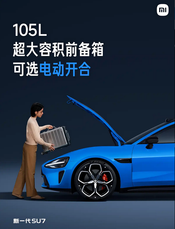 新款小米SU7在外观上延续原有轿跑比例,整体轮廓未做大幅调整,重点集中在细节层面。最直观的变化来自前包围区域,毫米波雷达被集成至通风口位置,使前脸视觉更为简洁,同时也提升了传感器布局合理性。新增的电动前备厢容积为105L,可容纳标准登机箱,对于日常短途出行或补充储物空间具有实际意义。在纯电车型中,这一配置逐渐成为使用频率较高的功能点。