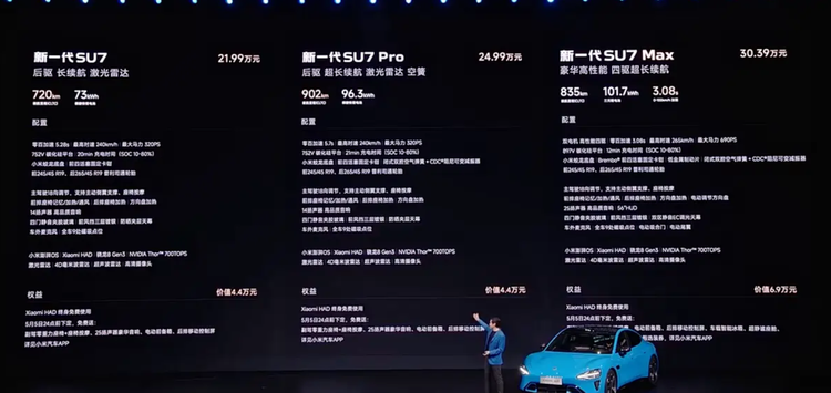 日前,我们从小米汽车官方获悉,新一代 小米SU7(参数|询价)正式上市,三款配置车型的定价区间为21.99-30.39万元,整体延续中高端纯电轿车的主流价格带。从版本划分来看,标准版、Pro版以及Max版分别对应日常通勤、长续航需求以及高性能取向用户。在导购维度下,这一价格体系的关键点在于入门门槛与配置覆盖。