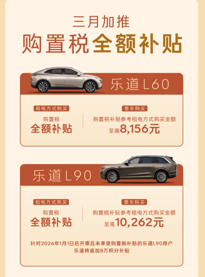 在政策福利上,乐道推出多重诚意补贴:从3月1日起,官方推出置税全额兜底,购买乐道车型至高可享10262元购置税补贴,L60车型至高补贴8156元,直接省下一笔大额开支;叠加官方七年超低息金融政策,年化费率低至0.49%,0金融服务费、0提前还款违约金,首付低至2.99万元起,日供仅69元,月供压力远低于燃油车贷款。