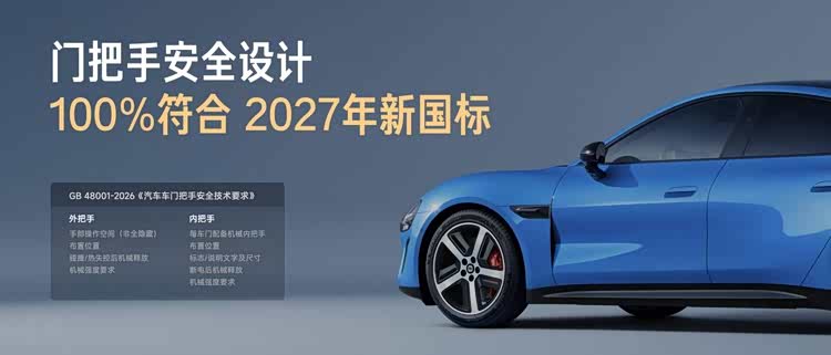新一代SU7在后排安全方面也做到了全面升级,全系标配9个安全气囊,有效提升在侧面碰撞场景下对后排乘员的保护能力,实现全方位安全防护。同时,全系标配门把手三重安全冗余设计,内部集成机械拉线结构与独立备用电源,即使在碰撞导致小电瓶断电的极端情况下,仍可确保车门从车内或车外手动解锁,保障乘员安全逃生,显著增强事故后的安全冗余与应急响应能力,新一代SU7的门把手设计100%满足2027年新国标。