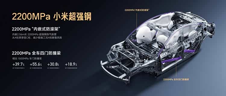 车身安全性能通过关键结构升级实现显著提升。顶部结构采用2200MPa小米超强钢,通过热气胀工艺构建贯穿A柱至C柱的「内嵌式防滚架」,材料抗拉强度较1500MPa提升40%,专为应对极端工况设计,有效增强车身顶部抗变形能力。侧部结构新增2200MPa小米超强钢四门防撞梁,前、后门防撞梁承载能力较1500MPa材料提升30%以上,显著降低侧面碰撞时车门侵入乘员舱的风险,提升乘员保护水平。