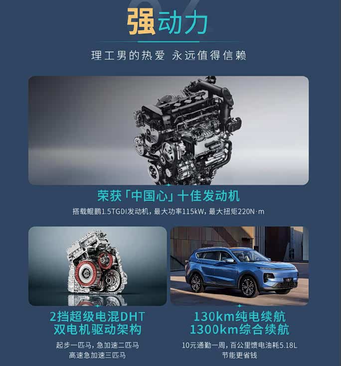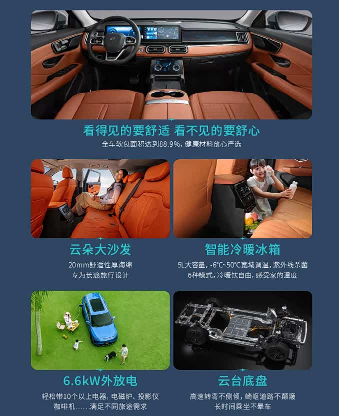 山海L7超越版则深耕混动赛道,搭载奇瑞鲲鹏1.5TGDI混动专用发动机,匹配两挡超级电混DHT,零百加速可达7秒级,动力响应迅速且平顺。该车纯电续航130km,综合续航超1300km,百公里馈电油耗仅5.18L,彻底解决用户续航焦虑与油耗顾虑。此外,新车配备6.6kW外放电功能,可选装冷暖冰箱,二排放倒后储物容积达1688L,兼顾日常家用与户外露营等多元场景需求。