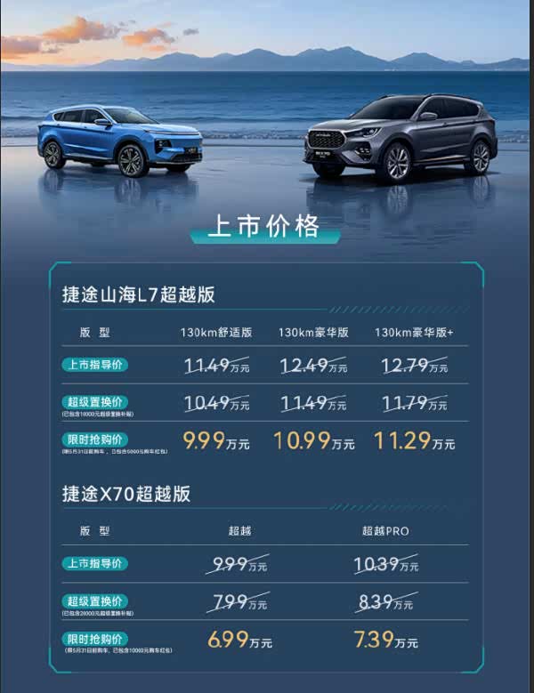 定价层面,两款新车诚意拉满,精准贴合不同预算家庭需求。其中,2026款捷途X70超越版推出2款燃油车型,官方指导价9.99万-10.39万元,限时抢购价6.99万-7.39万元,大幅降低燃油家用SUV准入门槛;山海L7超越版推出3款混动车型,官方指导价11.49万-12.79万元,限时抢购价9.99万-11.29万元,兼顾节能与动力,适配追求低油耗的家庭用户。