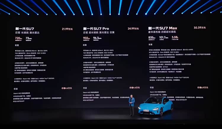 那也就是说,比之前小米汽车官方公布的22.99万元的预售起售价整整下调了1万元,三款车型售价区间21.99~30.39万元。这个价格正好跟前几天车快评所预测的一模一样,为什么说全新一代小米SU7 21.99万元的起售价很有诚意?那接下来就展开的聊一下。