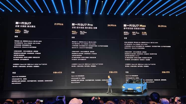 新一代SU7发布标准版、Pro版、Max版三个配置,售价21.99万~30.39万