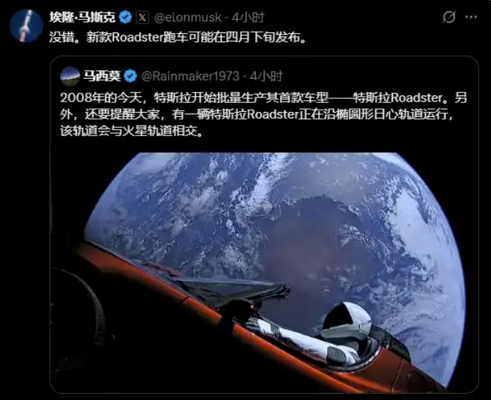 车家号·0浏览·2026-03-19 23:42 · 北京日前,马斯克在社交媒体上宣布,特斯拉全新Roadster将于4月下旬正式发布。作为特斯拉推出的第一款车型,首代Roadster于2008年问世,至今已过去18年,对于特斯拉而言意义非凡。