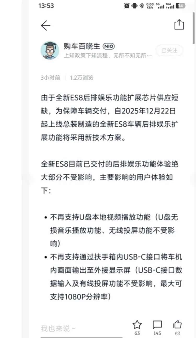 2025年9月20日,蔚来全新 ES8(参数|询价)正式上市,并在上市次日正式开启交付。然而,12月17日,蔚来官方突然发布通知,称由于全新ES8车型后排娱乐功能扩展芯片供应出现短缺,为确保车辆交付工作顺利进行,自2025年12月22日起,上线总装制造的全新ES8车辆后排娱乐扩展功能将采用新技术方案。