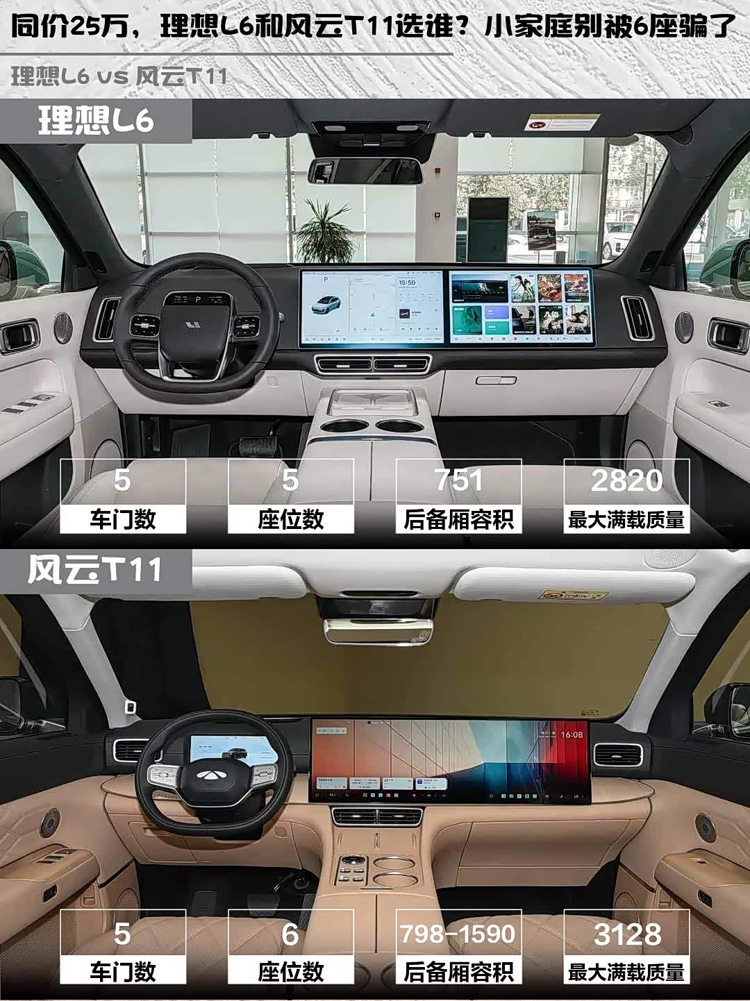 总结:小家庭选理想L6——配置均衡智能体验好;三代同堂选风云T11——空间多变舒适性拉满。你们会更倾向哪台?