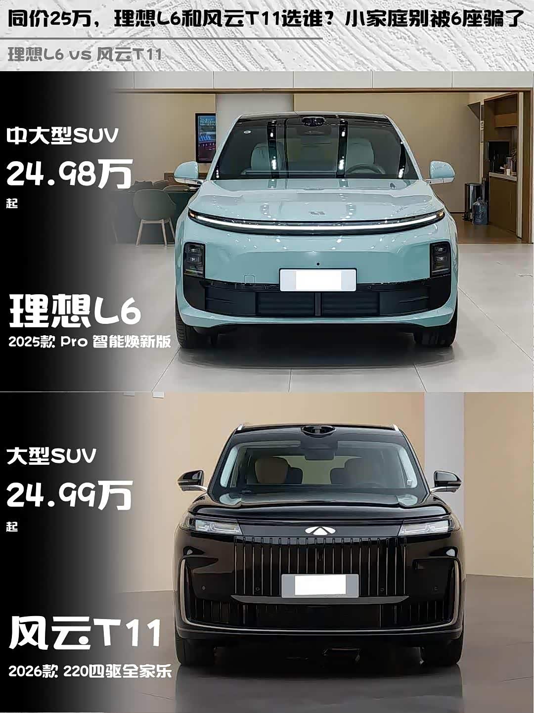 理想L6 Pro智能焕新版24.98万,风云T11 220四驱全家乐24.99万,几乎同价!但L6有5年/10万公里质保,风云T11是3年/10万公里(可买终身质保)。