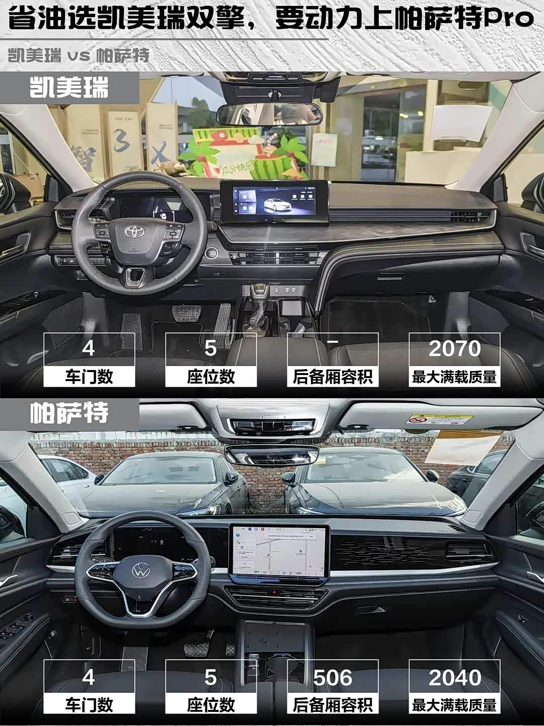 最近在选车的小伙伴看过来!今天给大家深度对比两款热门中型车—— 凯美瑞(参数|询价) 2026款 双擎 2.0HGVP 豪华版 vs 帕萨特 2026款 Pro 300TSI 龙耀版,实测干货直接上菜!🍵