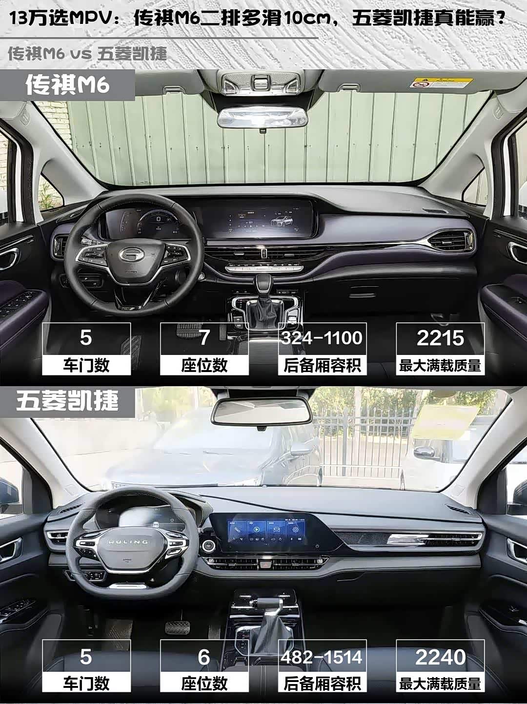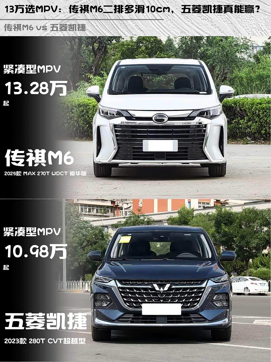 车家号·0浏览·2026-03-20 08:48 · 北京最近家里准备换辆MPV,纠结 传祺M6(参数|询价) 2025款 MAX 270T WDCT 豪华版和五菱凯捷 2023款 280T CVT超越型好久,终于试驾完来交作业了!这两款都是13万左右的实用派,但细节差异真的值得细品👀