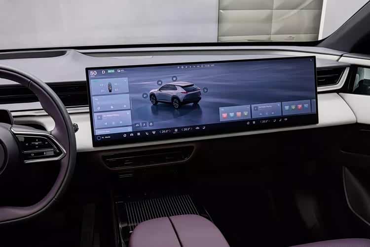内饰焦点落在于控台中央醒目的 26 寸 5K 显示屏幕,并以 AR-HUD 抬头显示器取代传统仪表,两侧也设有车侧后视摄影镜头的显示屏,打造出极具科技感的数字化座舱,而双色内饰布置也营造出更为高级的座舱质感。