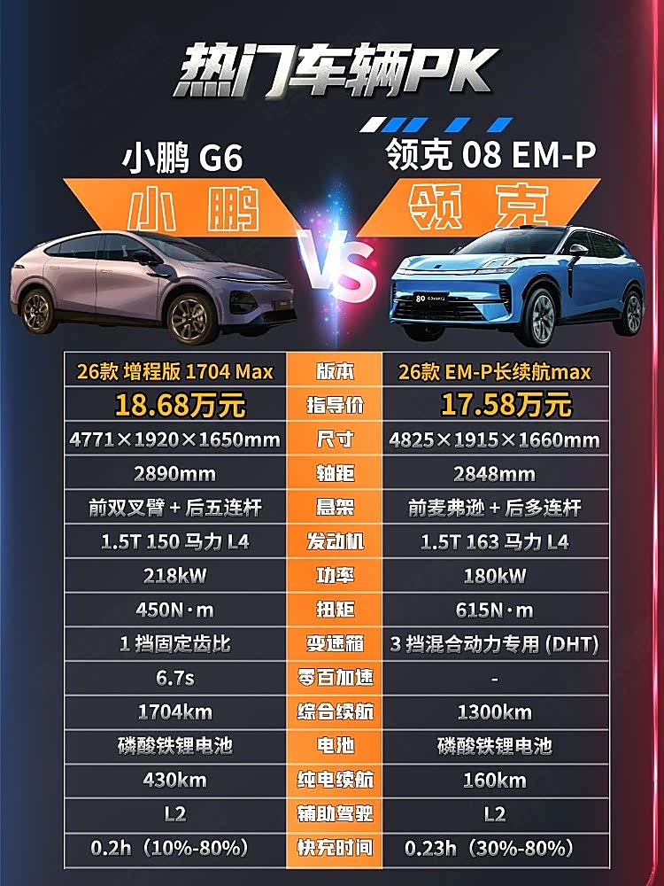 近期,小鹏 G6 超级增程版正式上市,2026 款小鹏 G6 增程 1704 Max官方指导价 18.68 万元。领克 08 EM-P 160 长续航 Max版官方指导价 17.58 万元,二者售价相近形成了竞争关系,那么哪款车更符合你的胃口呢?