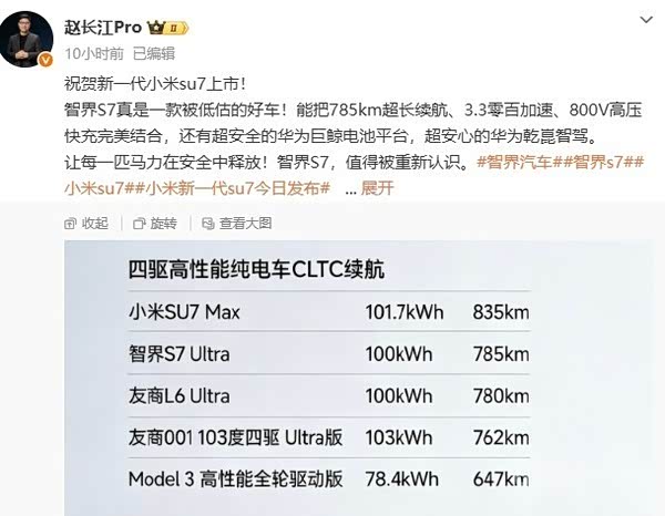 智界赵长江祝贺新一代小米SU7上市:S7被低估了