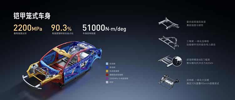 新一代SU7延续C-NCAP五星、C-IASI G+安全评级,全系标配2200MPa小米超强钢,车身高强度钢与铝合金占比达90.3%。A柱至C柱内嵌防滚架,四门防撞梁承载能力提升30%以上,全系标配9安全气囊,门把手设计满足2027年新国标要求。