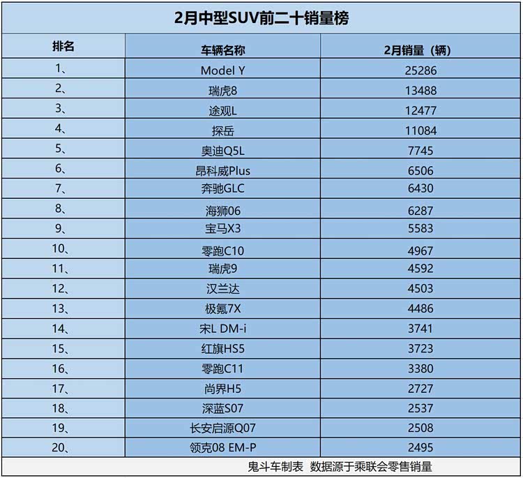 那么,哪些中型SUV更值得网友们选择,不妨看看销量榜单做个参考。日前,乘联会零售销量数据出炉,鬼哥整理出2月中型SUV市场销量排名前二十榜单,从榜单上看到,2月份,共有4款中型SUV销量过万,接下来,看看具体车型排名与销量表现。