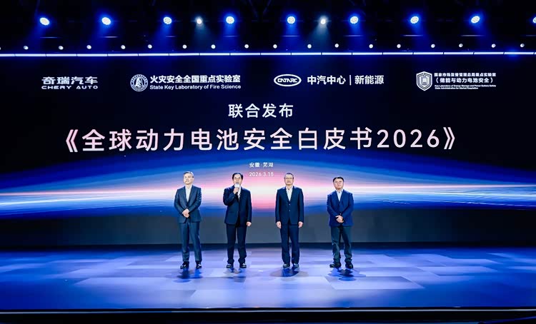 奇瑞还联合火灾安全全国重点实验室、中汽中心新能源等权威机构,现场发布《全球动力电池安全白皮书2026》,推动全球动力电池安全标准迭代升级。